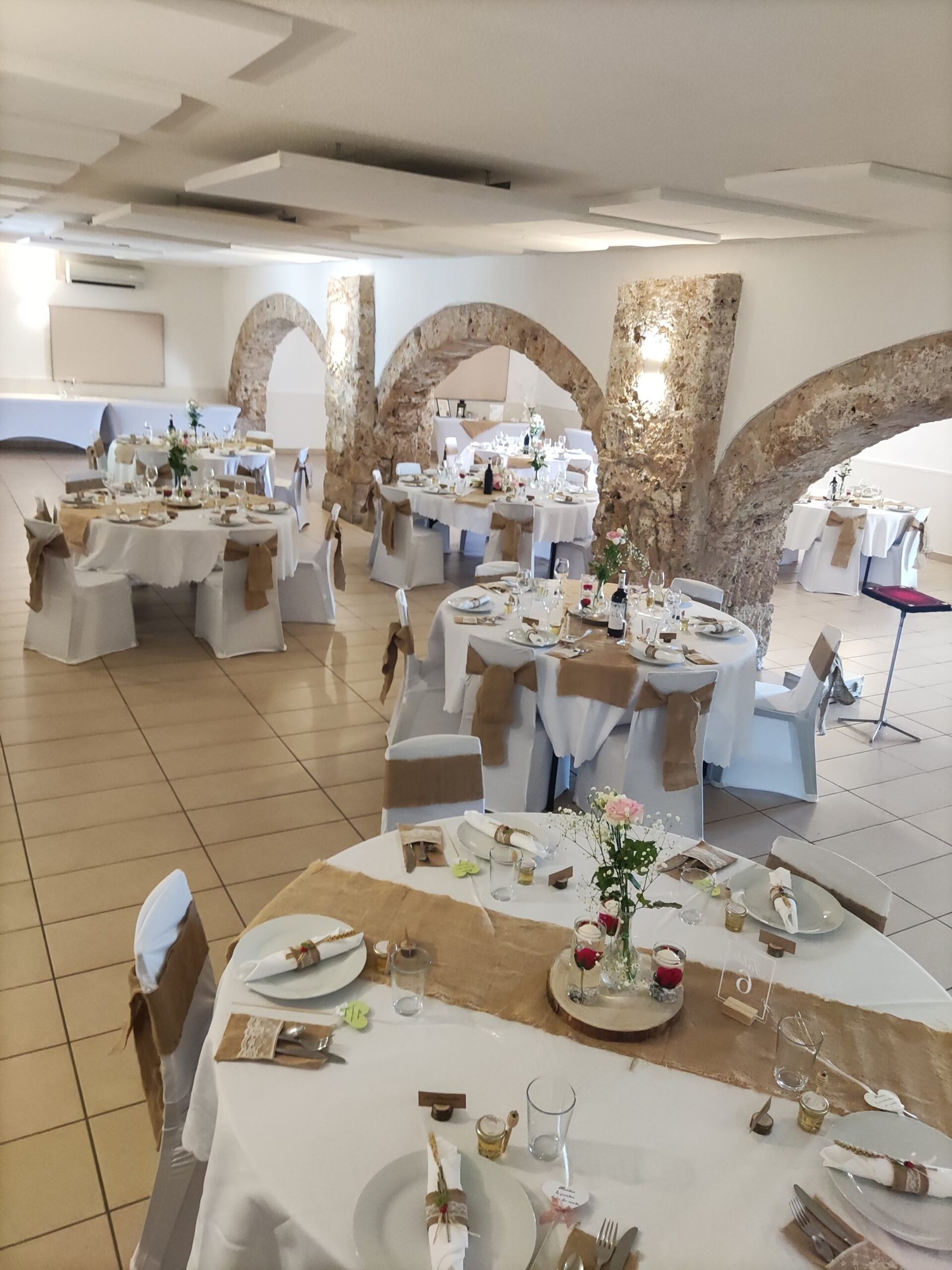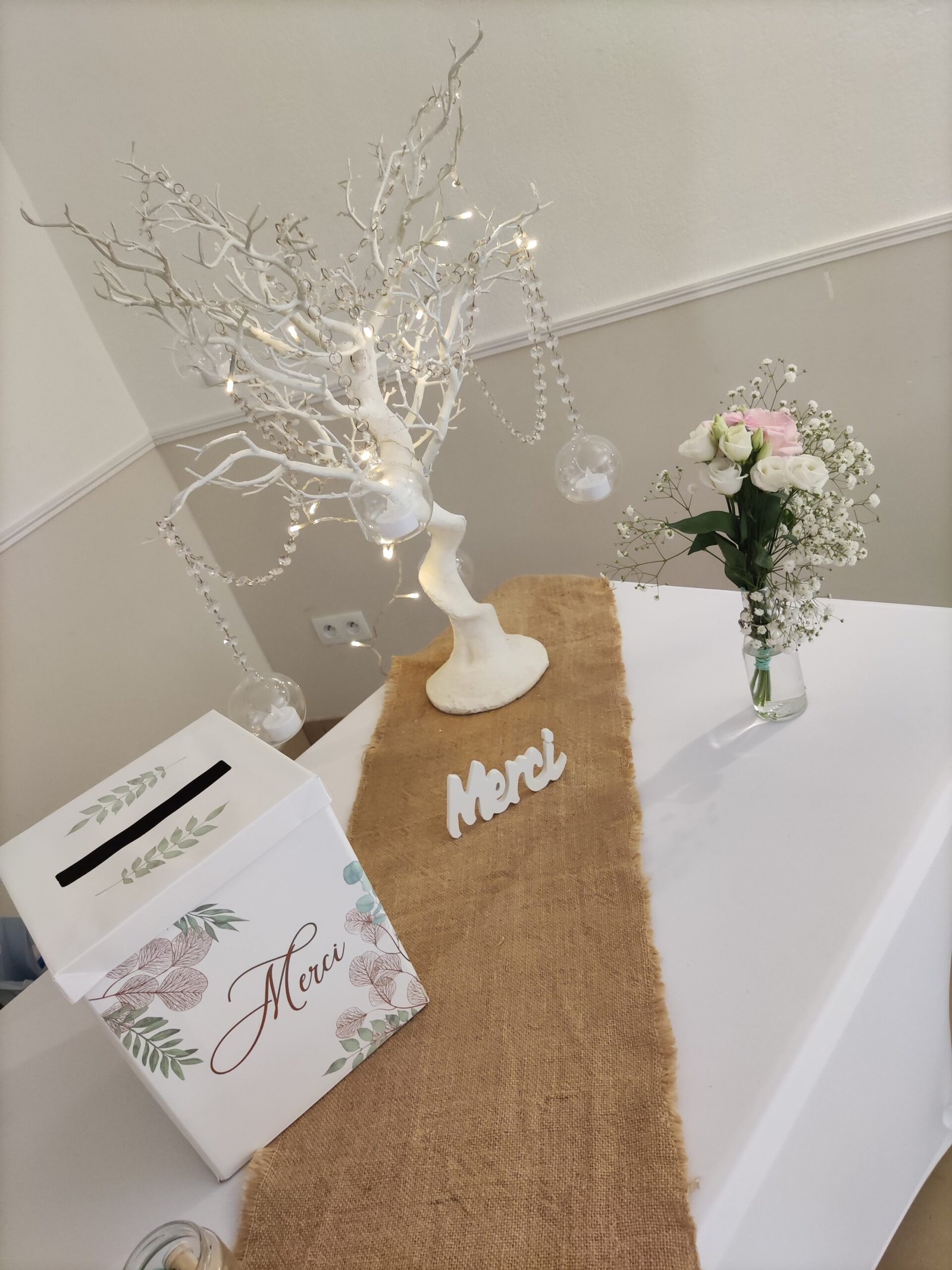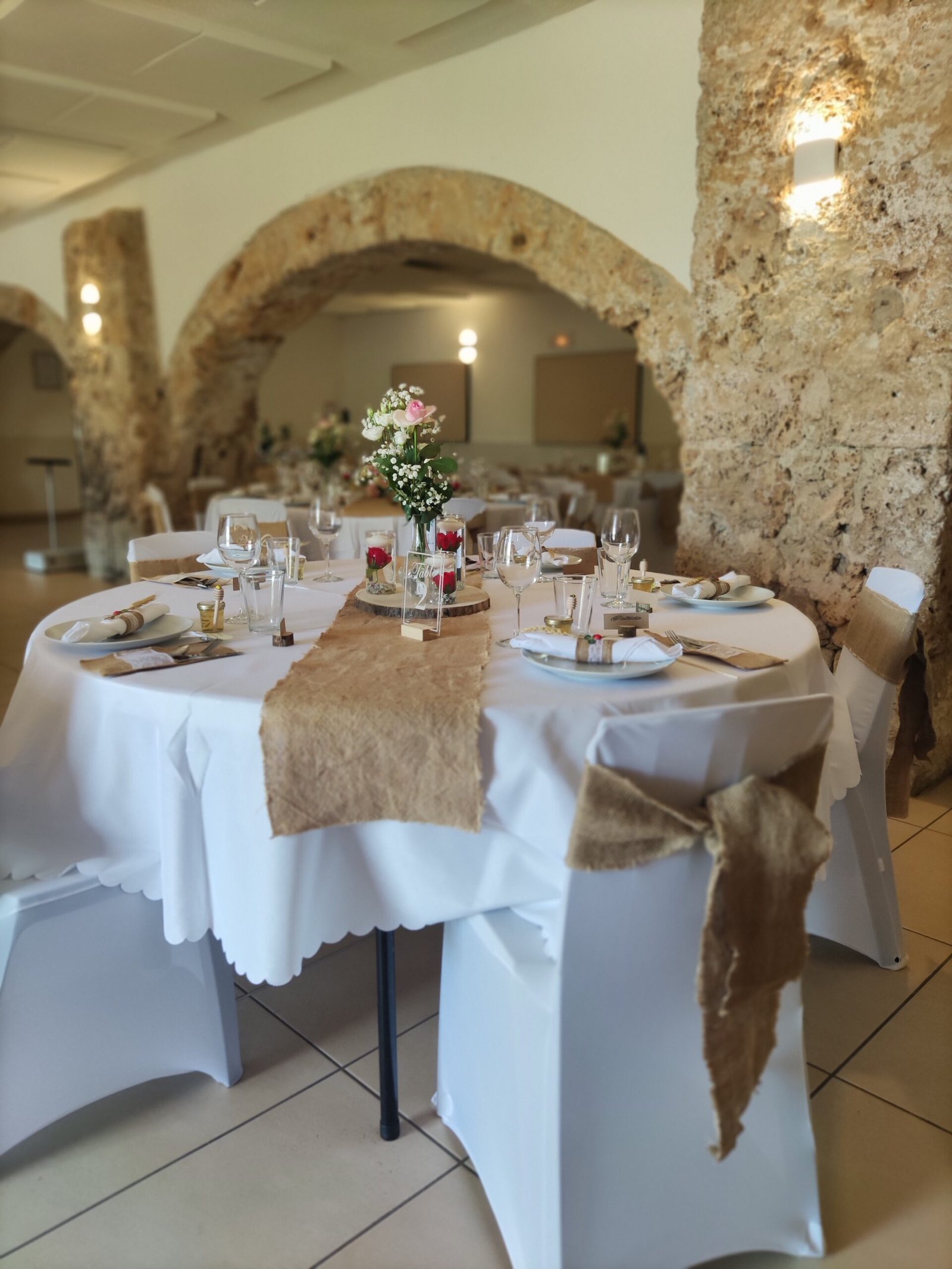 Mise en place de décoration, location de mobilier et décorations : centres de table, chemins de table, nœuds de chaises, arbre artificiel, compositions florales, arche en bois, accessoires divers...