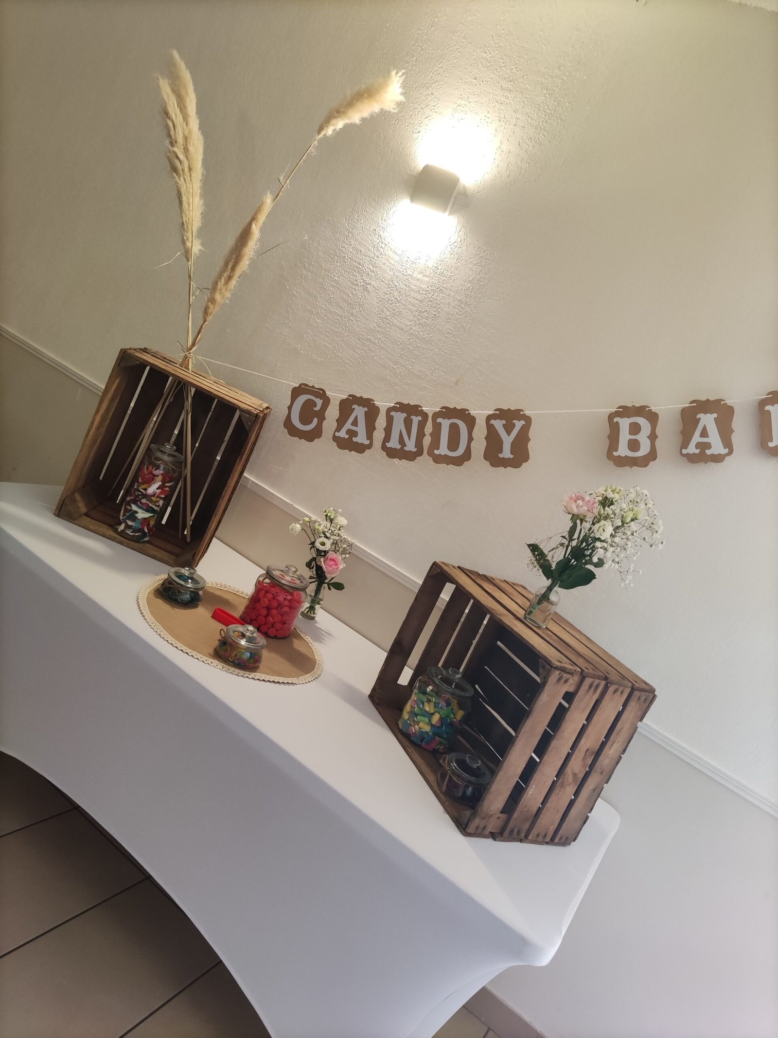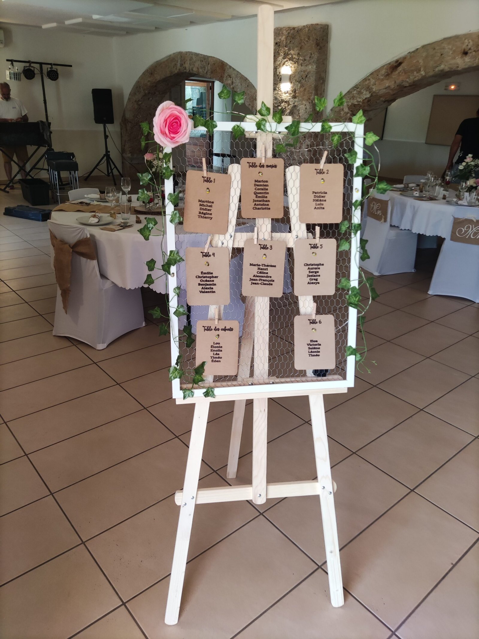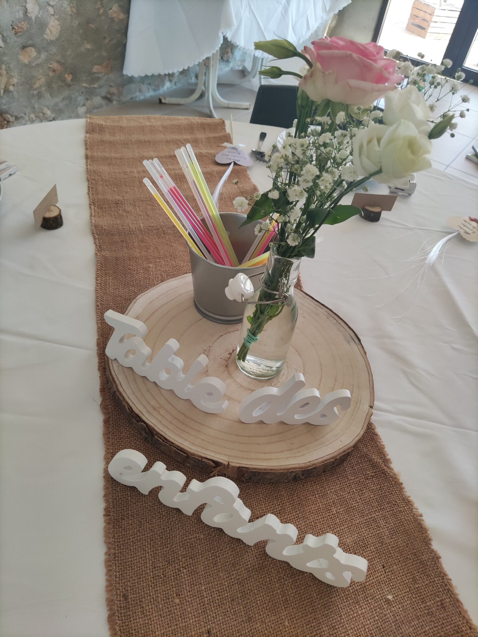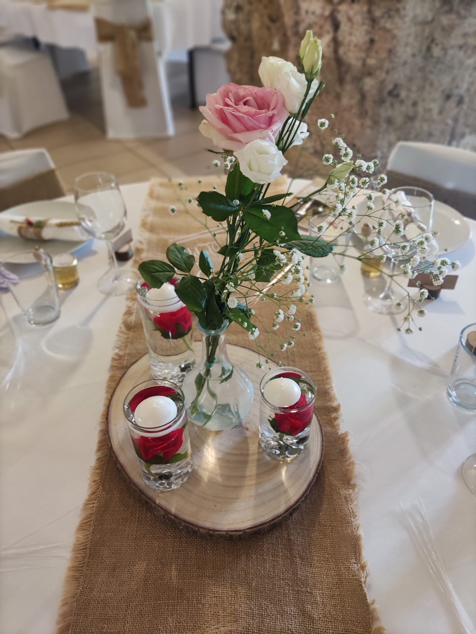 Mise en place de décoration, location de mobilier et décorations : centres de table, chemins de table, nœuds de chaises, arbre artificiel, compositions florales, arche en bois, accessoires divers...