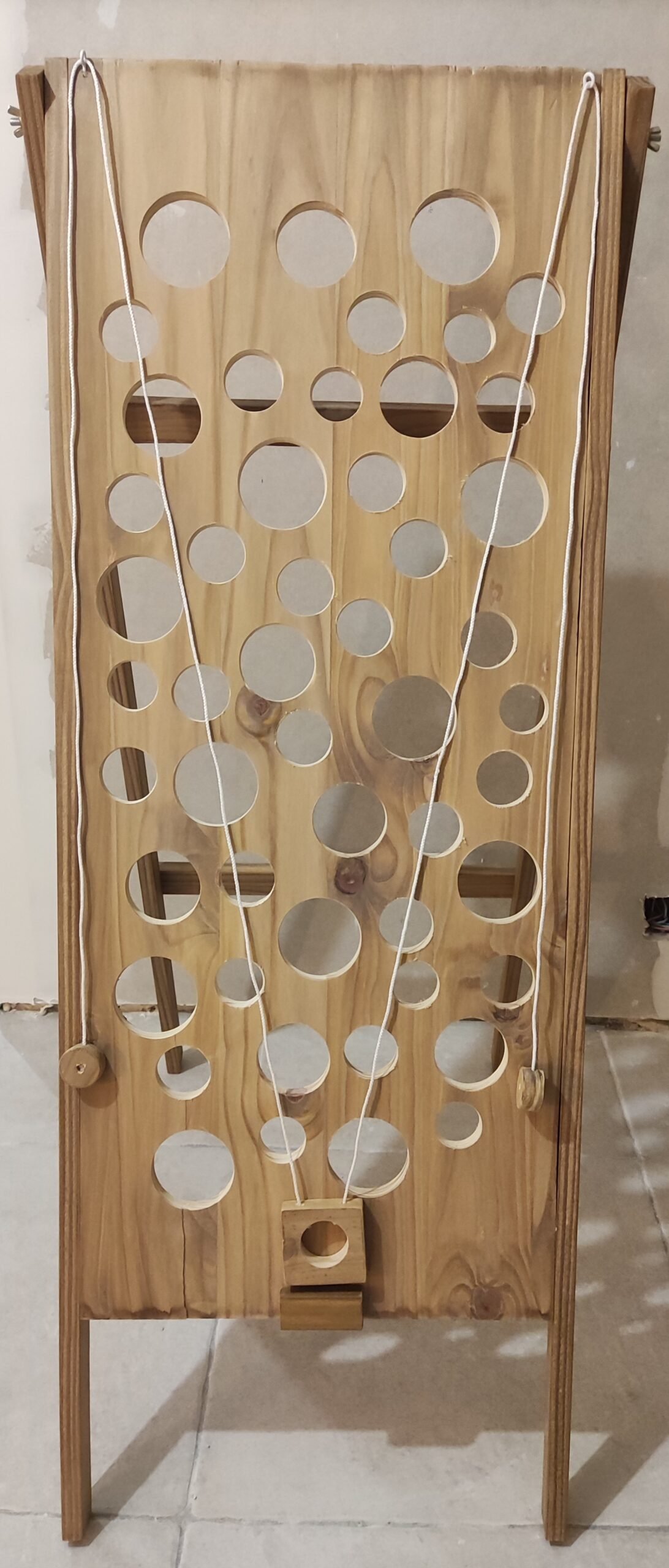 Le but du jeu étant de faire monter la bille tout en haut de la planche à l'aide des ficelles.
